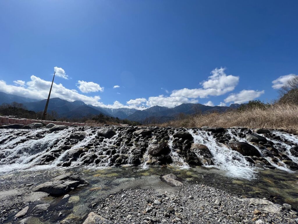 自然豊かな川があります。南アルプスの清流、大武川。川幅は広く、浅いので小さなお子様でも安心して水遊びが楽しめます。