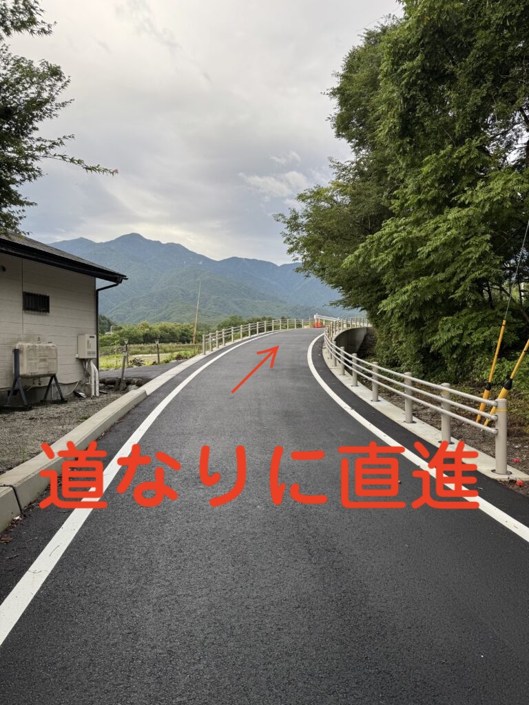 左折して、道なりに100mほど進みます。橋近くの住宅の敷地・庭には絶対に立ち入らないでください。