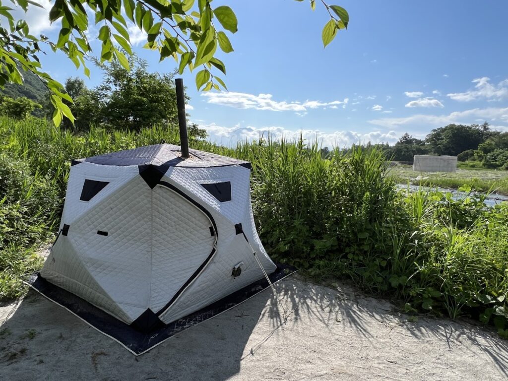 テントサウナの設営やストーブのセッティングは熟練したスタッフが行いますが、車から川原への荷物運び、テント設営時に支えてもらうなど簡単なことはお客様にも手伝っていただきます。
